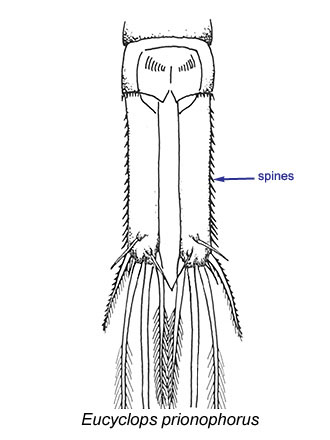 Caudal ramus with row of small spines along outer margin (female only) and usually more than four times as long as wide, total length usually > 0.7 mm.