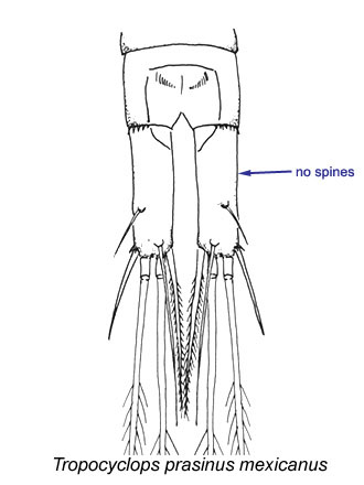 Caudal ramus without row of small spines along lateral margin and less than four times as long as wide, total length usually < 0.6 mm.