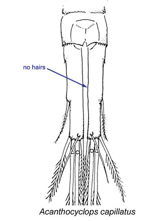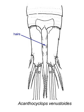 23b. Inner surface of caudal ramus with small tufts of hair; ramus less than 4.5 times as long as wide; lateral seta inserted in distal third of ramus.